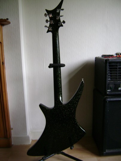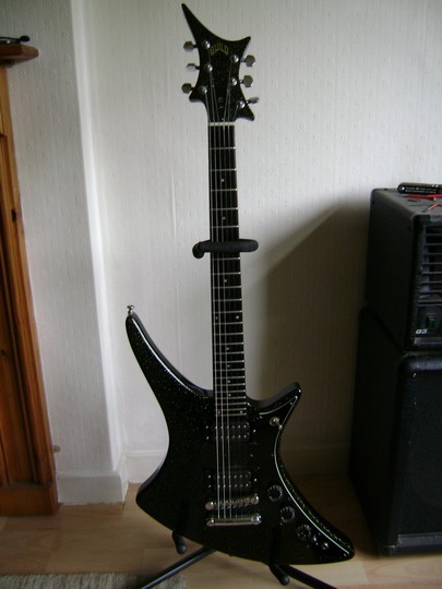 Pickups are two Guild XR-7 humbuckers made by Dimarzio, controlled by two volume and one tone controls and a 3-way selector switch. This model also has a phase switch. Black sparkle finish with ebony fretboard, 24 frets, Gibson scale length. This an excellent guitar to play, with the build quality you would expect from Guild.