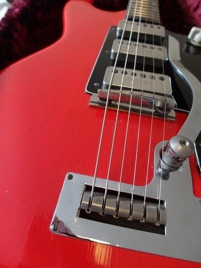 The present owner has had it since 1963, and the receipt and original guarantee are included. It comes complete with its original "Slimline" Selmer case covered in a beautiful light grey imitation crocodile skin material. Heavy brass corner protectors were fitted, and the inside of the case was lined in crimson plush. These were expensive, 8 guineas (£8.40) in 1963, and are steadily going up in value these days. Having an original case in this condition is rare, and adds considerably to the value of this guitar.