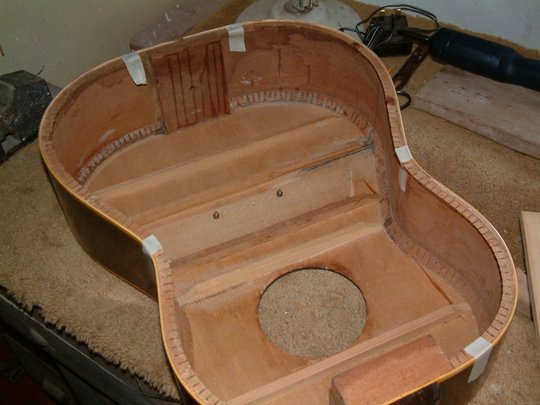 Gibson and Martin used to lacquer over the scratchplate, and as the plastic shrank a crack often developed alongside the scratchplate. This needs repairing and cleating, and the pickguard can then be reinstalled over the finish to avoid any repetition. There were also a number of old, repaired cracks on the back to fix and cleat, and several of the braces were loose or missing. Although this is common on Gibsons, in this case the guitar had probably got wet at some time, to judge from the water stains inside. It was easiest to remove the back to do all the work. Once the back had been replaced, it was time for a new bone nut and saddle and a refret, and this vintage LG1 was ready to go.