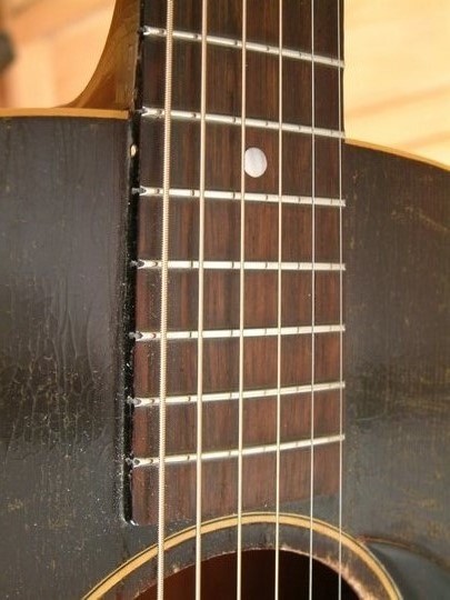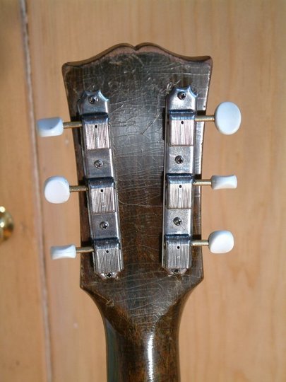 The tuners were buffed to remove the rust, leaving them looking 'aged' but not neglected. The buttons disintegrated at a touch, which is typical of some 40s and 50s plastics. The shafts were cleaned up and fitted with a set of replacement buttons from Stewart Macdonald. If desired, they can be aged with some strong tea, which will colour almost any plastic if left long enough! The pickguard cracks are common features.