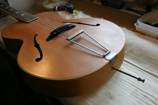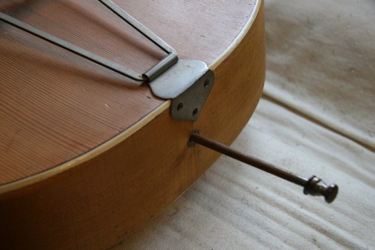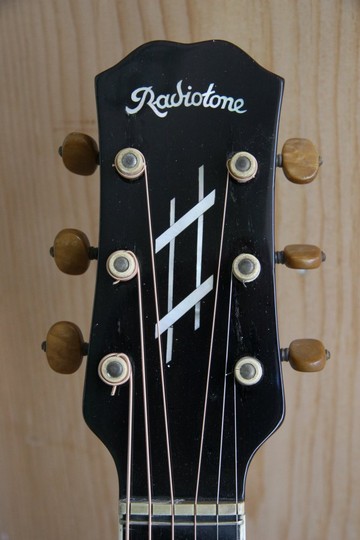 Radiotones were made in Schönbach, a small town in Czechoslovakia (today Luby u Chebu in the Czech Republic), which was an important lutherie centre before World War 2. It's a proper carved top archtop, which makes more than a nod in the direction of Gibson's L-5 and L-7 models. Solid spruce top, flame maple back and sides and the ebony on the fingerboard is of a quality you just can't find these days. Interestingly, the end pin was the termination of a steel rod that went right through the body and engaged with a threaded insert in the heel block. This wasn't used to adjust the action as the neck joint was a glued mortice and tenon type, but rather to ensure stability.