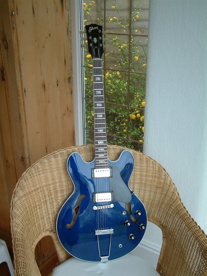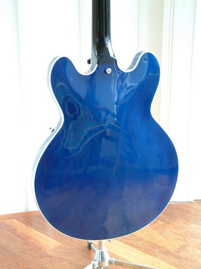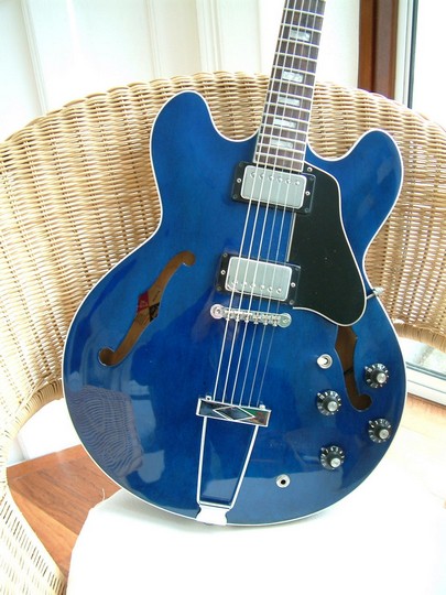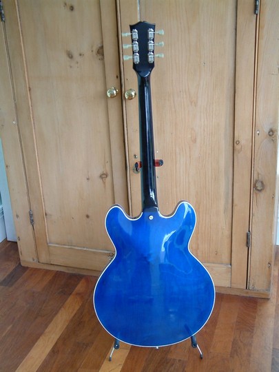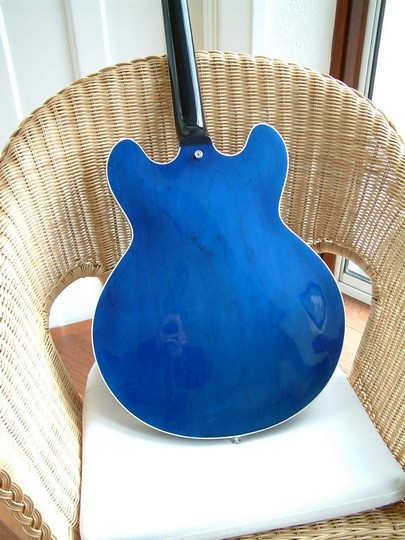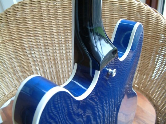 This guitar started life with a rather nondescript version of Gibson's walnut finish. The present owner is a Moody Blues fan, and bought it with the intention of getting it refinished in translucent blue. Apparently Gibson made a couple of blue 335s in 1974 when Justin Hayward was cutting his Blue Guitars album. Hayward had one, and the other was given way as a prize in the US. This was quite a tricky project, as the walnut stain had to be removed from the wood without sanding through the top veneer. Strangely, the wood used for the back was of a much better quality than the front. As usual, re-installing the electrics was an exercise in patience.