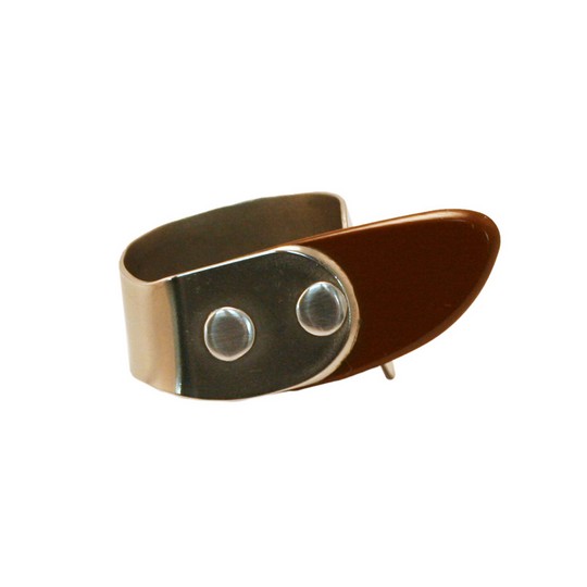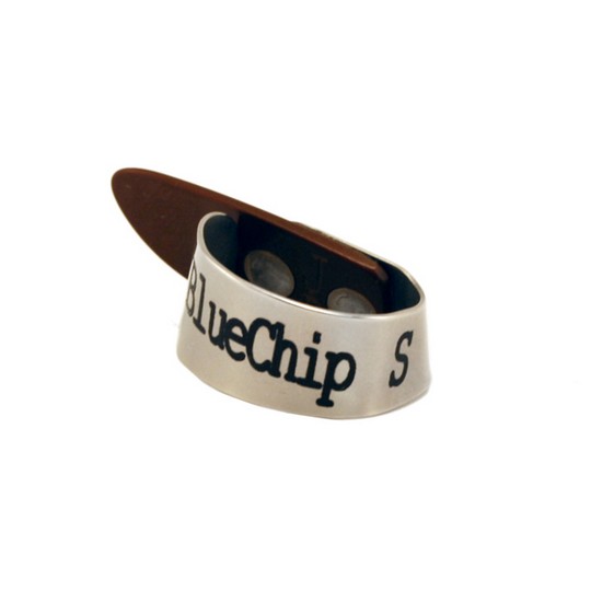 This pick was designed by JD Crowe and constructed to his very exacting specifications. The pick bears JD's initials on the inside between the rivets. It is constructed using a custom designed stainless steel band and a 50/1000 of an inch(1.25mm) thick BlueChip pick. These picks are laser etched, professionally machined, and hand beveled to create the best thumb pick available.