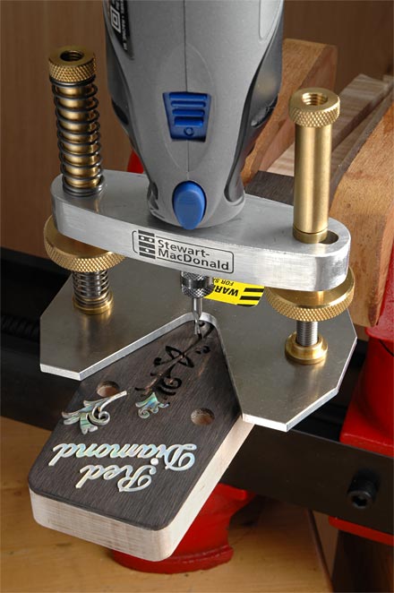 Sturdy, compact, and adjustable. Each turn of the large knurled thumbwheels adjusts your Dremel's cutting depth by .035" (.889mm). You can rout an inlay cavity that's precisely compensated for the thickness of the pearl and glue, for less sanding later.
